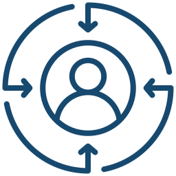 Ein Icon mit einer Person in der Mitte, umgeben von Pfeilen, die eine Kreislauf- oder Wiederholungsfunktion symbolisieren.