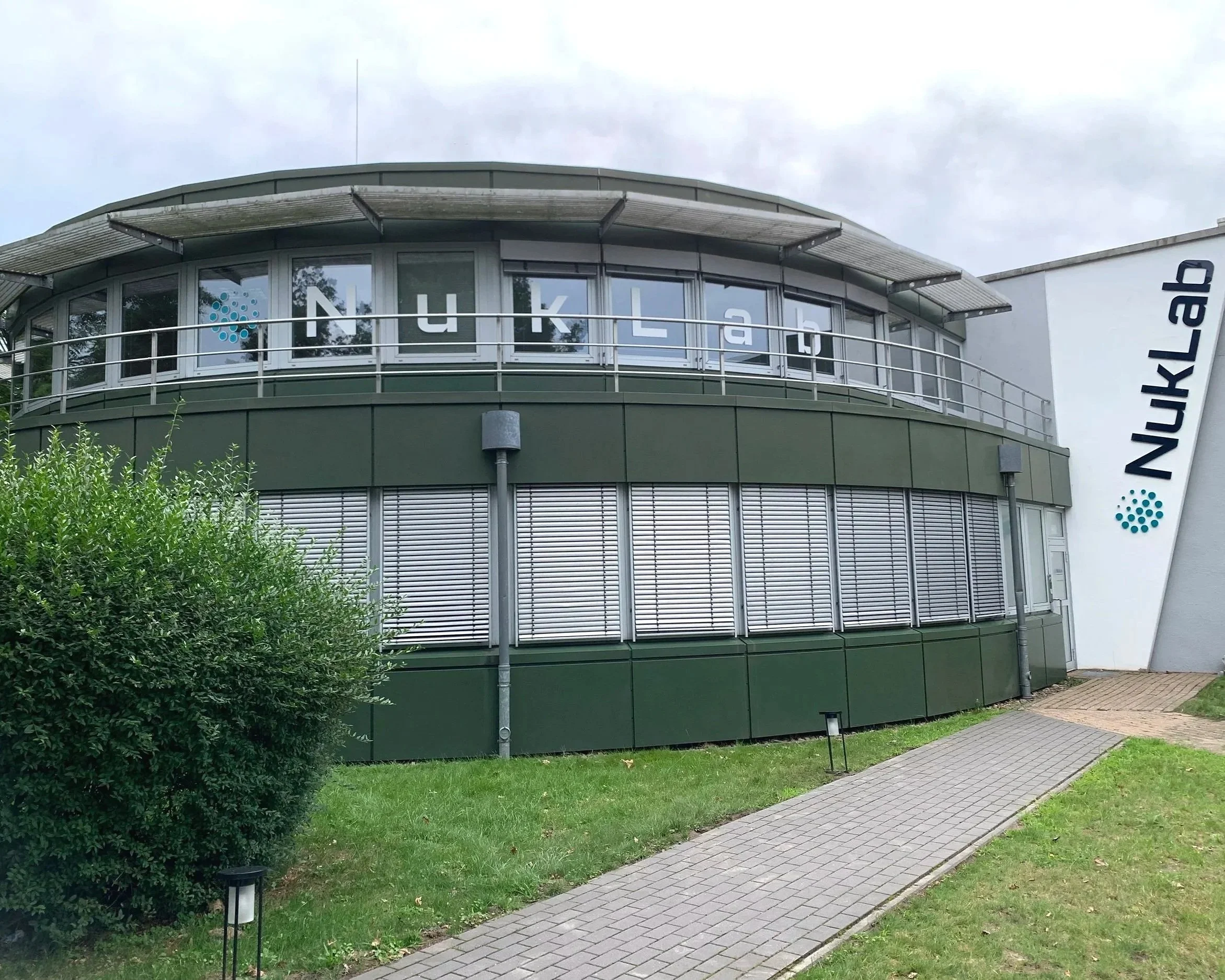 Außenansicht eines modernen Gebäudes mit dem Logo und der Beschriftung 'NukLab' auf der Fassade.